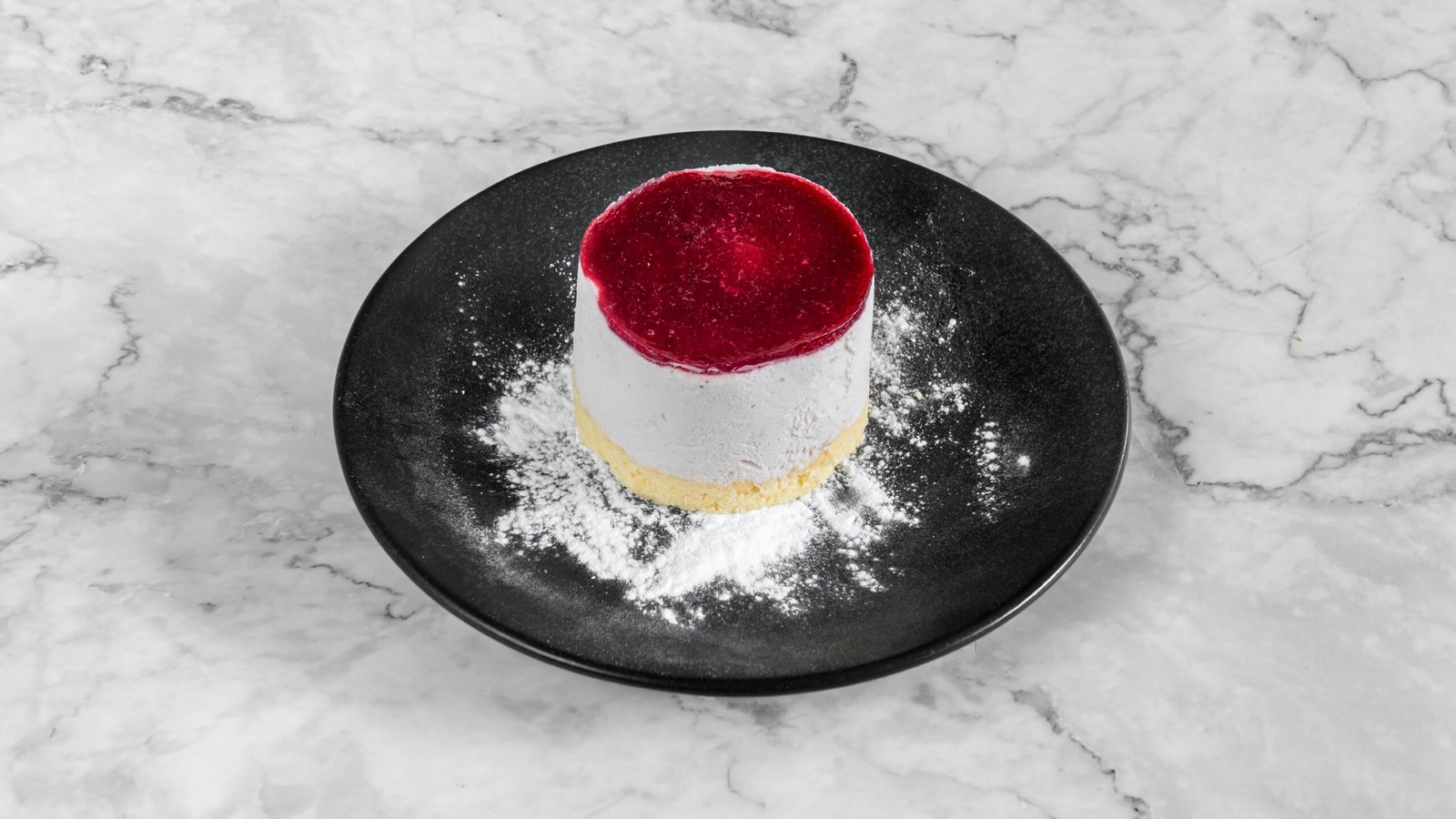 A rich and creamy cherry cheesecake on a buttery biscuit base.